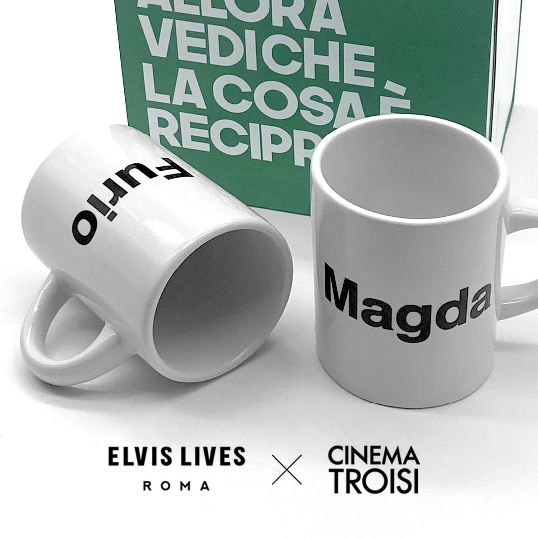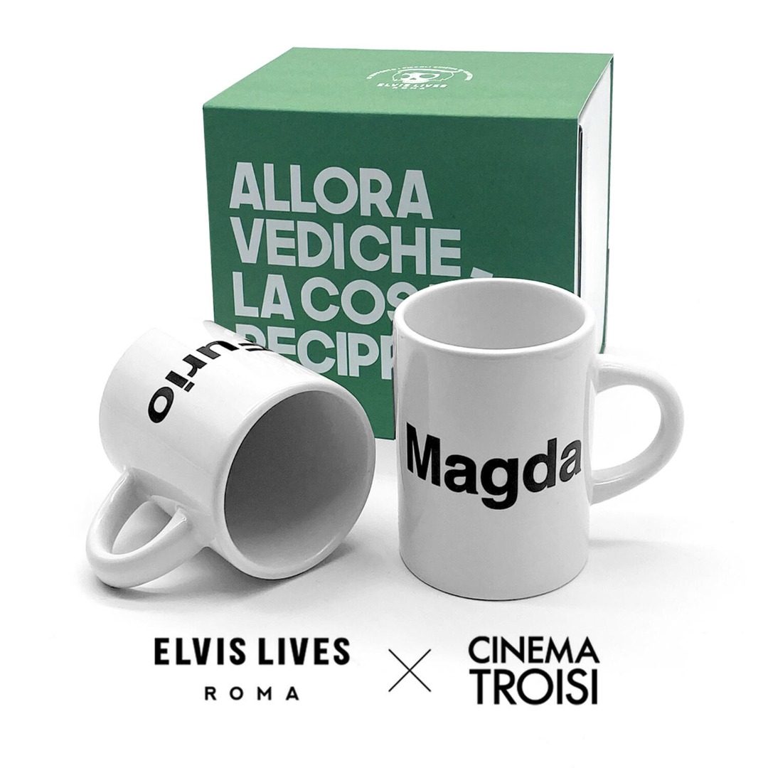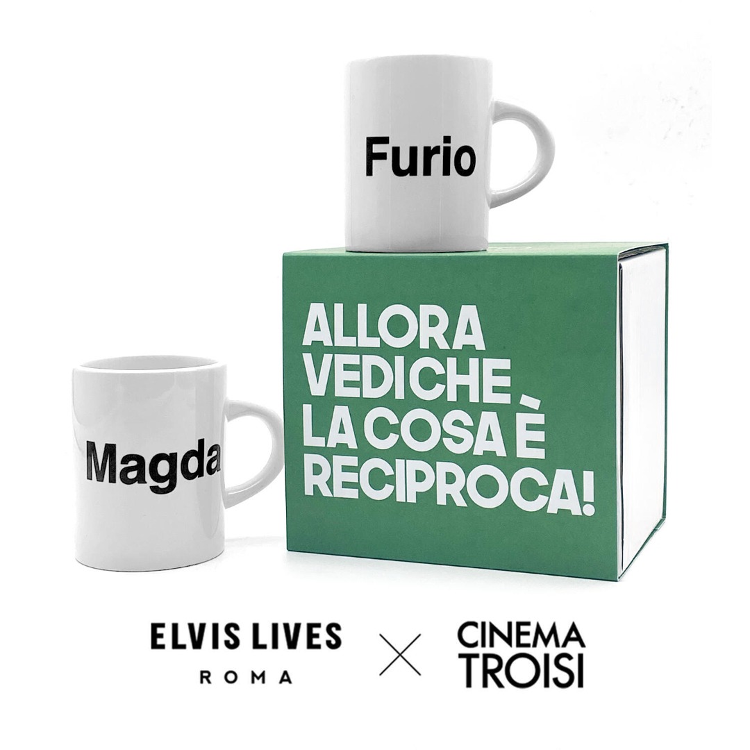 Coppia di tazzine da caffè in ceramica, una con la scritta "Magda" e l\'altra con la scritta "Furio", perché in tutte le coppie, indipendentemente da come sono assortite, c\'è sempre una Magda ed un Furio.