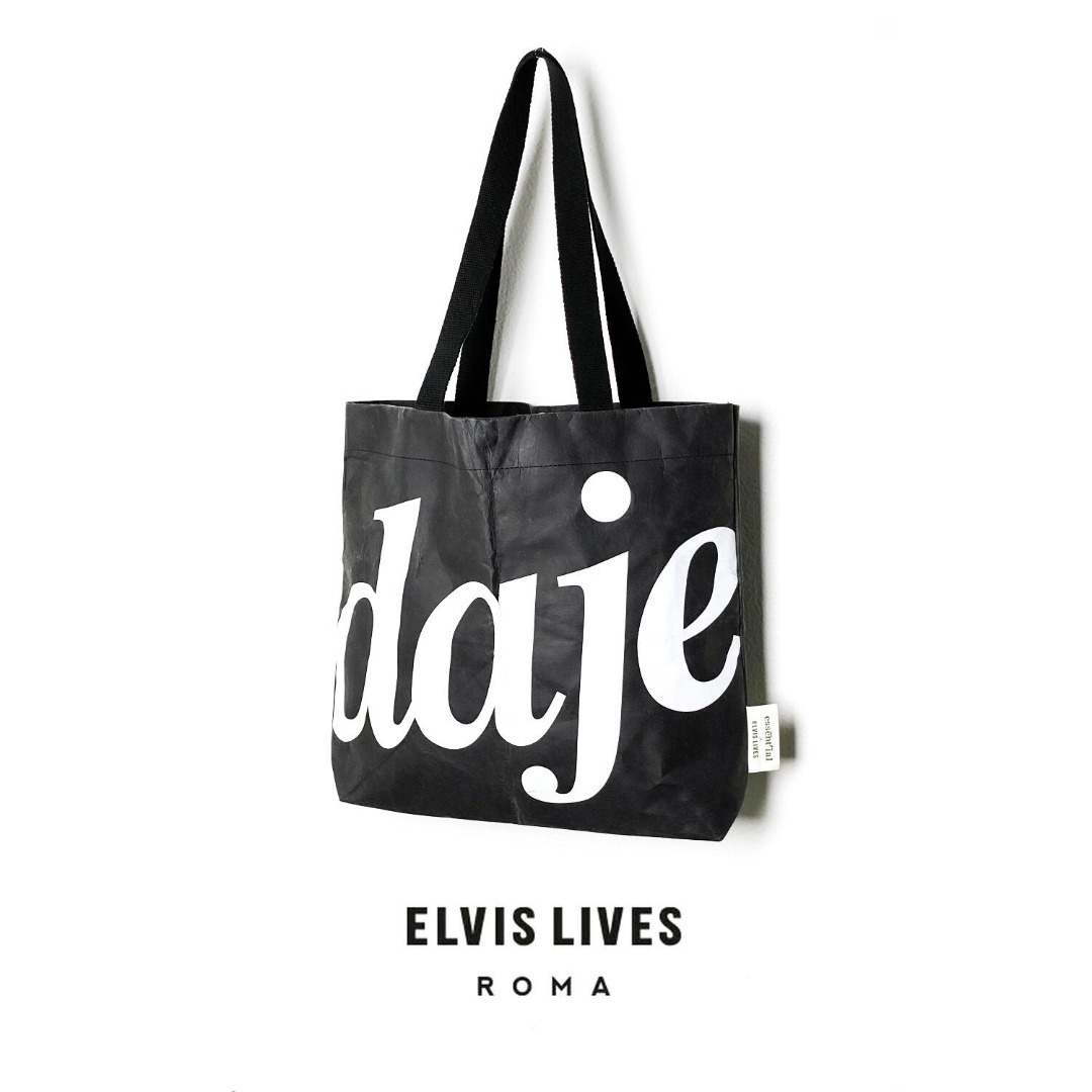 Ecco la nostra Tote Bag Daje disegnata in collaborazione con Essent\'ial e realizzata in fibra di cellulosa lavabile con stampa serigrafica.