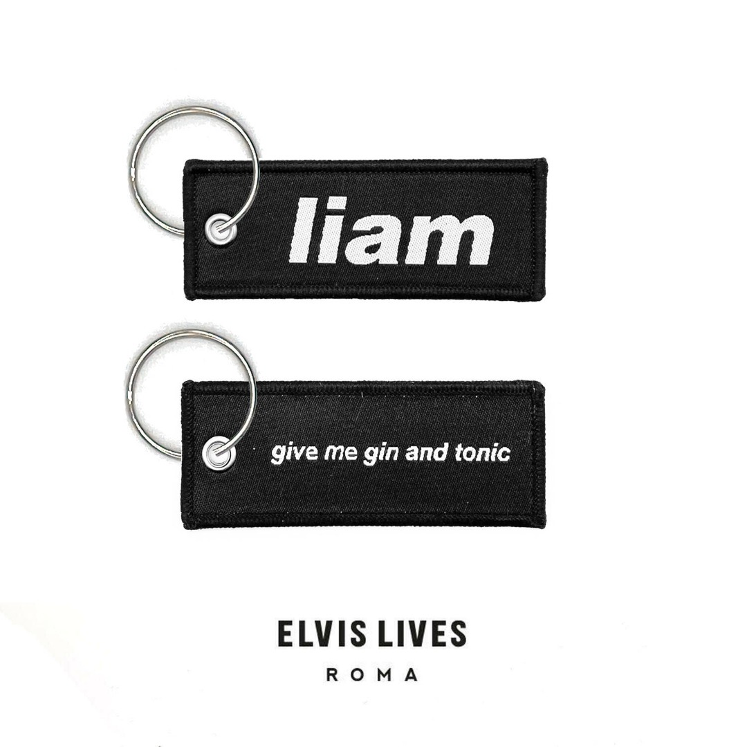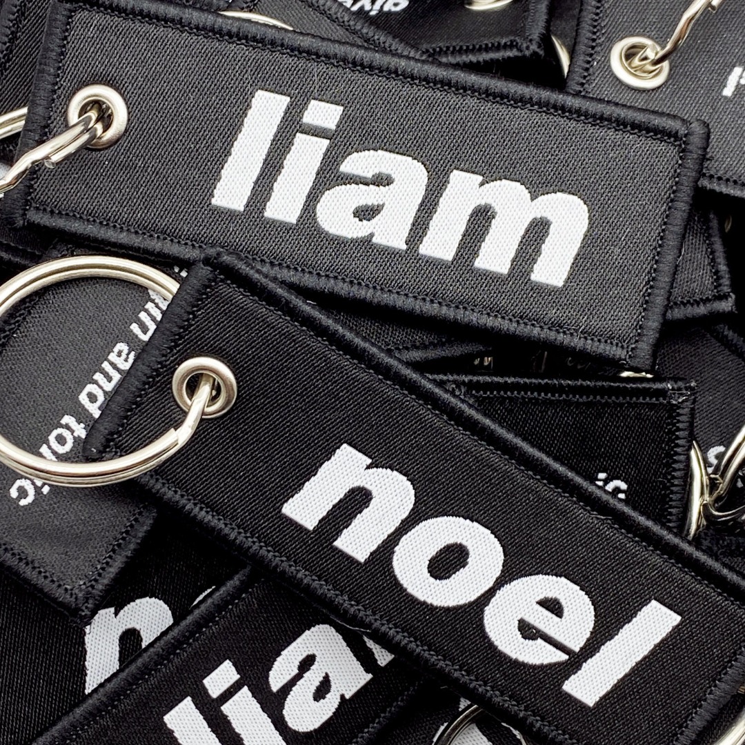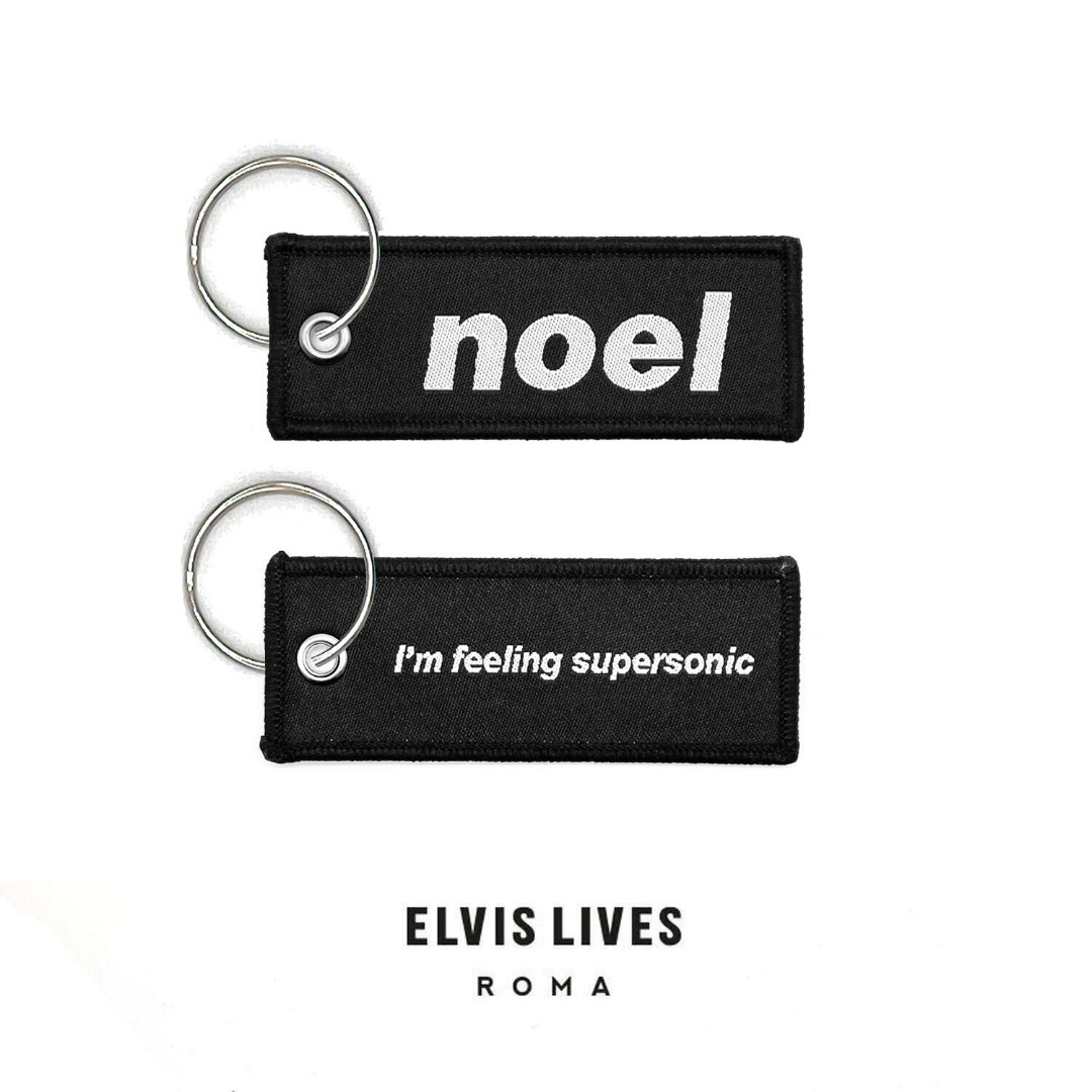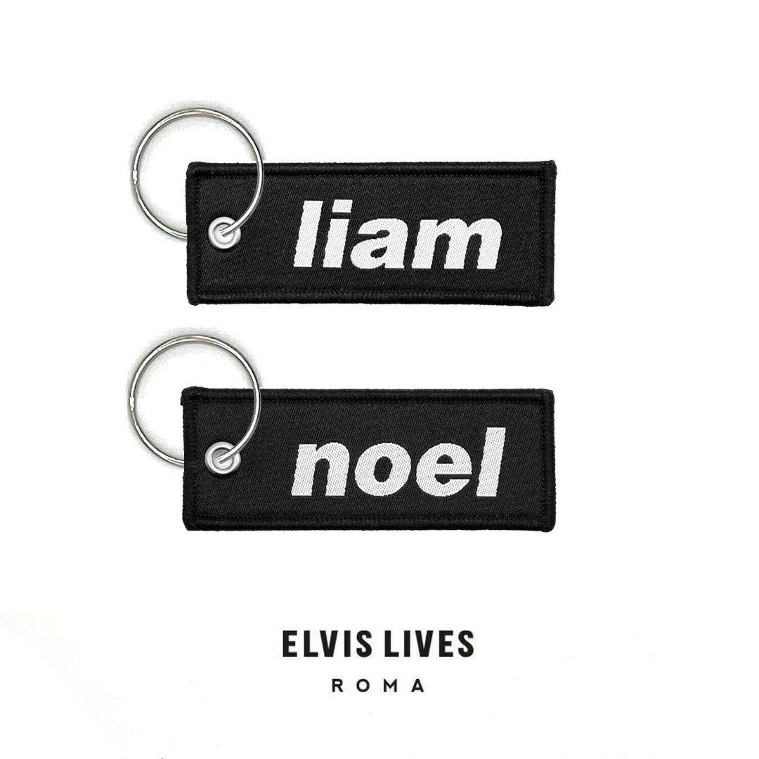 Coppia di portachiavi ricamati fronte e retro con definizione micro HD, uno con la scritta "Noel" sul fronte e "I\'m feeling supersonic" sul retro e l\'altro con la scritta "Liam" sul fronte e "Give me gin and tonic" sul retro.