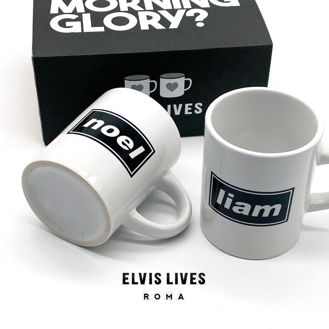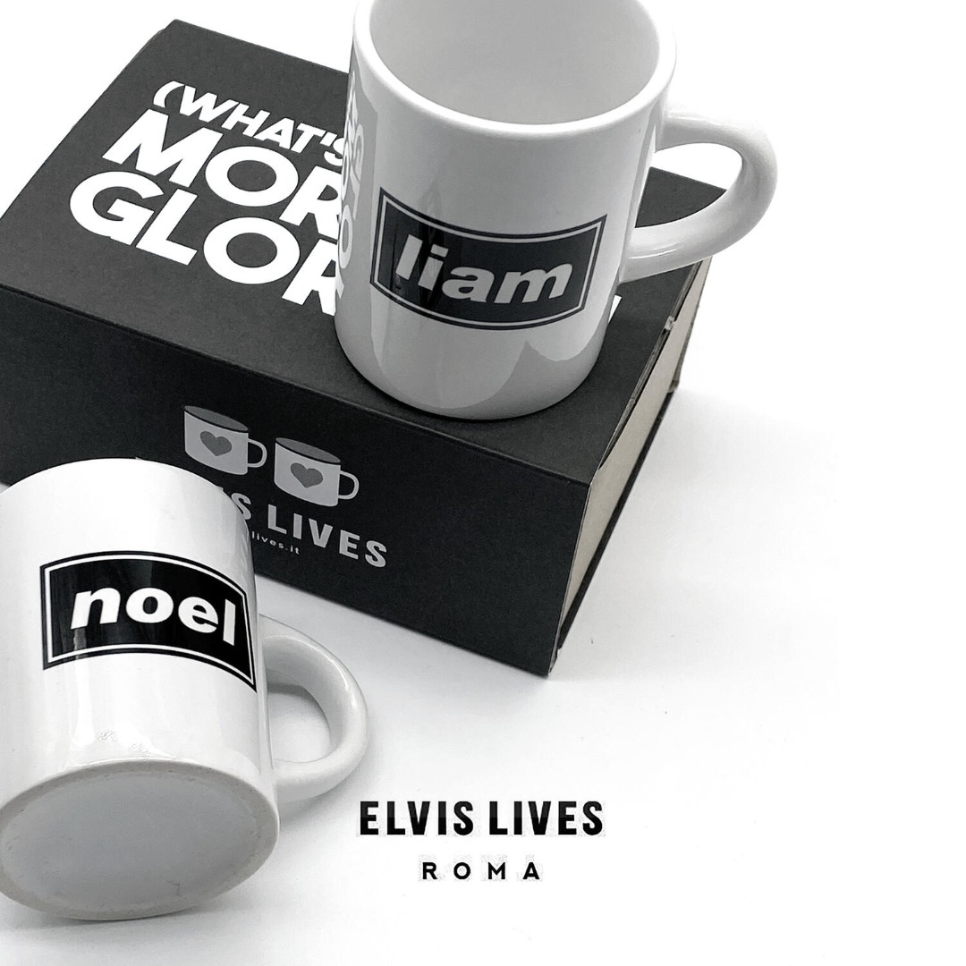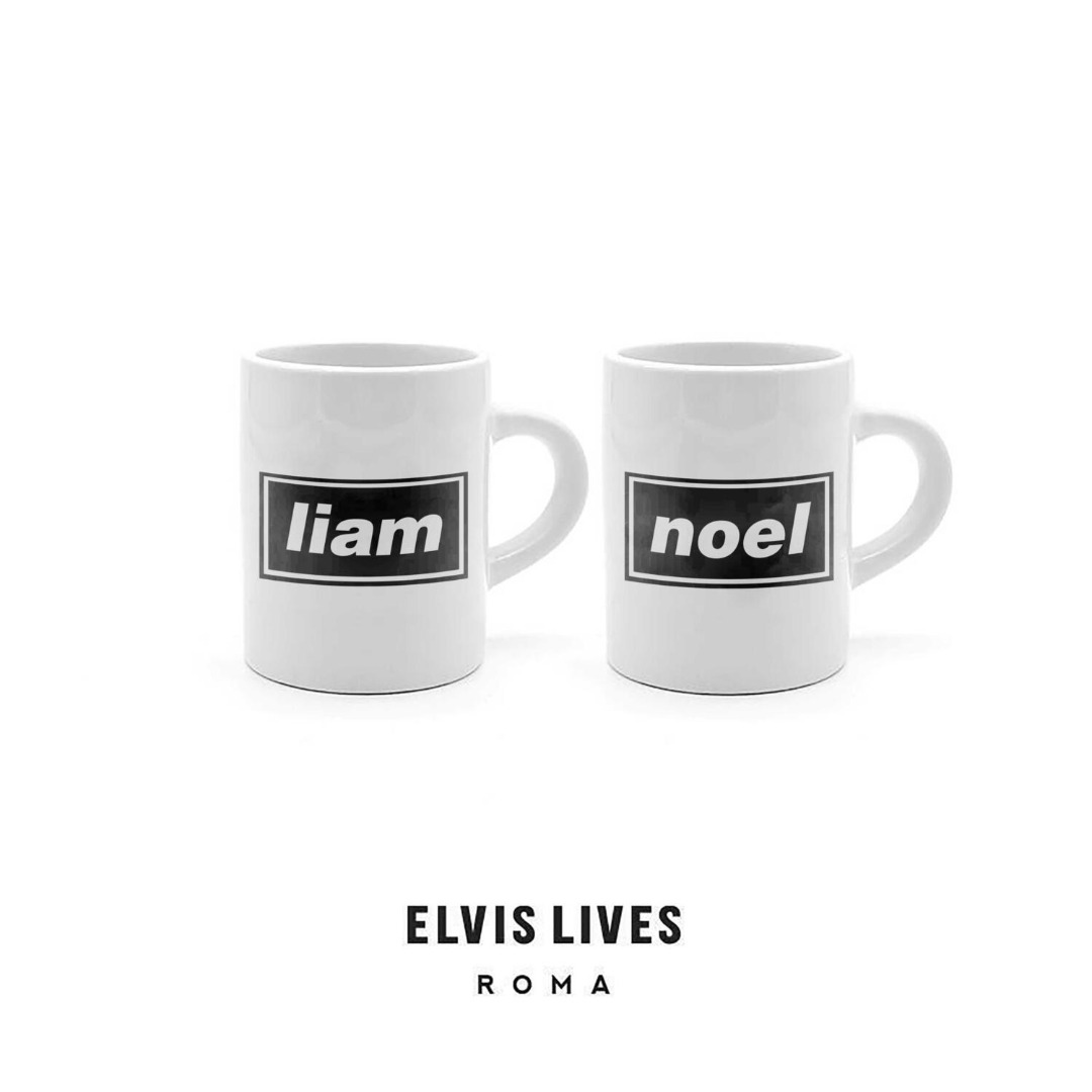 Coppia di tazzine da caffè in ceramica, una con la scritta "Liam" e l\'altra con la scritta "Noel", perché in tutte le coppie, indipendentemente da come sono assortite, c\'è sempre un Liam ed un Noel.