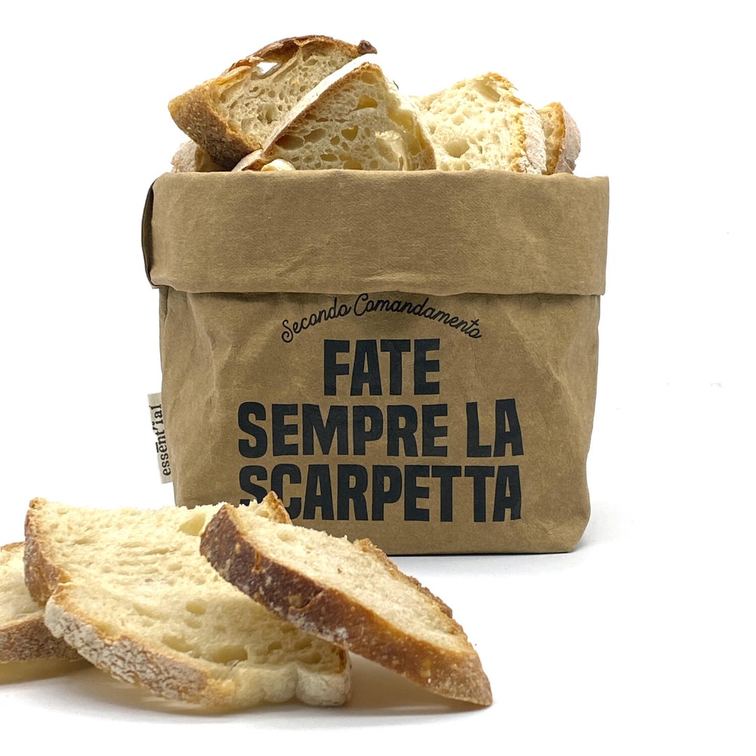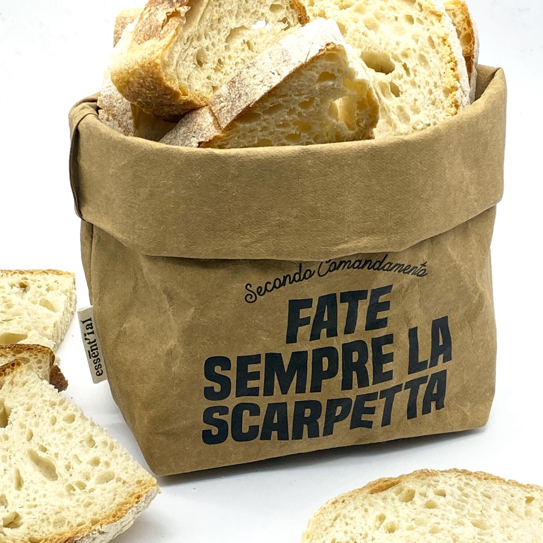 Sacchetto contenitore multiuso con stampa effetto vintage, realizzato in fibra di cellulosa lavabile, idonea al contatto con alimenti.