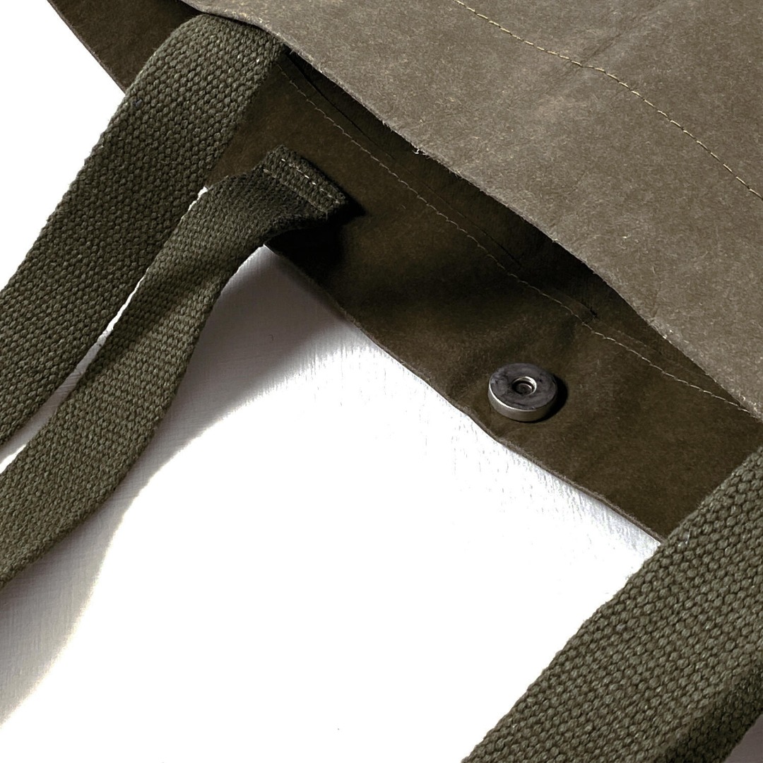 La borsa è dotata di chiusura con bottone calamita e i manici sono realizzati in cotone rigenerato 100%.